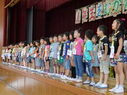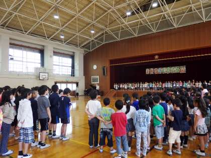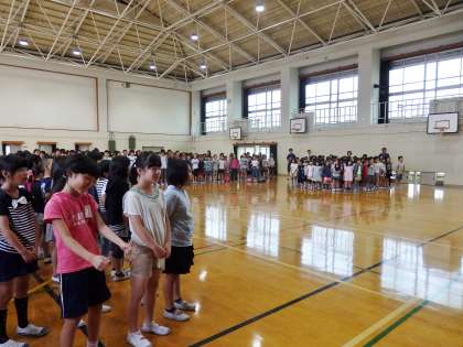 学年の出し物の後は全校合唱をしました。今月の曲『いいことありそう』と,去年から歌っている曲『笑顔でいよう』の2曲を歌いました。2曲目は上と下のパートに分かれて,綺麗にハモリながら歌うことができました。