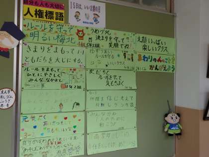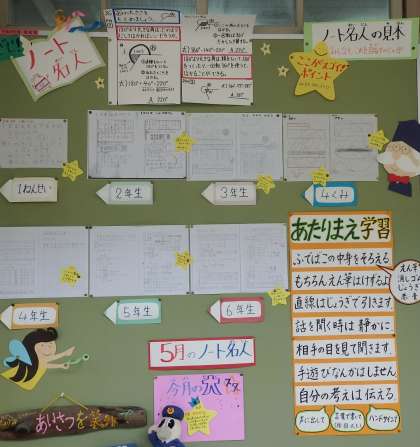 職員室前の掲示物が少し前から変わっています。各クラスの人権標語と,5月の『ノート名人』です。人権標語はクラスで考えたルールや友だちを大切にするための標語です。これをクラスで守っていこう!という意気込みが感じられます。