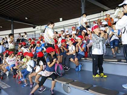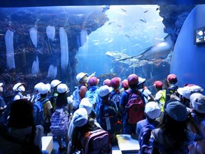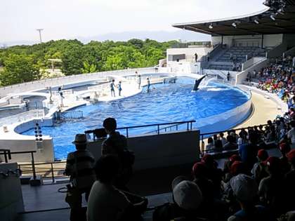 イルカショーが始まりました。子どもたちにはストロー笛が配られました。大ジャンプに拍手喝采。次の大水槽には,エイがゆったりと泳いでいます。