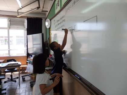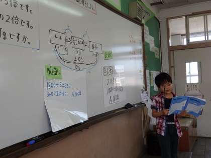 4年生は「何倍ですか」の学習をしています。この単元は協力指導の先生が授業をしています。1組は今日がこの単元の最後の日でした。今まで考えてきた「大事」をしっかり考えながら,みんなで図を作り上げます。どのような計算で問題を解いたのか,考え方を発表したり付け足したりしながら,学習のまとめをしました。
