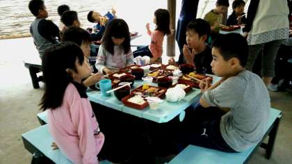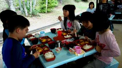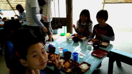晩御飯の様子です。今日の夕飯は白身魚のフライとミートボール、小松菜に里芋、リンゴゼリーにパイナップルも付く豪華弁当です!参加者全員元気です。