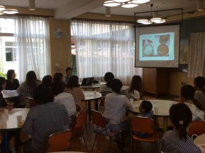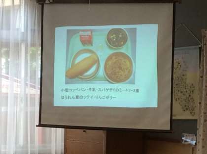 PTA教養部主催の給食試食会が実施されました。1年生の保護者,PTA教養部や広報部の方々にお集まりいただき,栄養職員の早田先生から食についてのお話をしていただきました。今日の献立は,厚あげのごまみそそぼろとかまぼこと小松菜のいためもの。厚あげのごまみそそぼろは新献立です。ねりごまと信州みその風味が抜群でした。1年生の配膳の様子や給食をいただいている様子も少し参観していただきました。ご家庭でもぜひ,食についての話題を子どもさんとともにしていただきたいです。