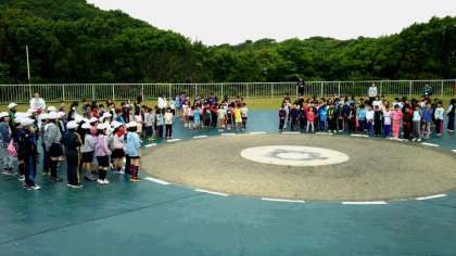 おはようございます。朝6時に起きて,7時から「朝の集い」をしています。一緒にみさきの家に宿泊している,砂川小学校・南太秦小学校と一緒に,校歌を歌ったり学校紹介をしたりしています。