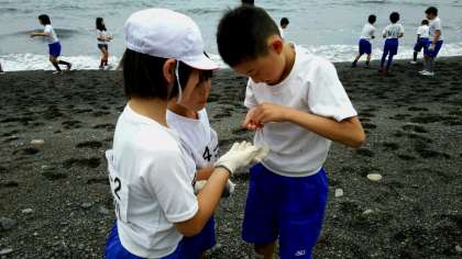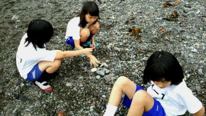 浜で何か見つけたようですね。きれいな貝殻も見つかりました。絵を描くのに手ごろな大きさと形の石もそれぞれに探し出しました。