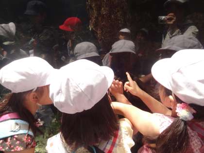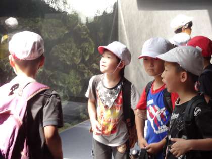 生き物が泳ぐ姿を真剣なまなざしで観ています。