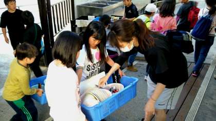 美味しいご飯のあとは,自分達で後片付け。「来た時よりも美しく」が合言葉です。先生たちに洗い残しをチェックしてもらいます。かまどで使った大鍋はススだらけで洗うのも一苦労です!一生懸命金だわしで擦りながら洗いました。OKをもらえるまで何度でも洗い直しです。数もそろっているか,1つ1つ確認します。