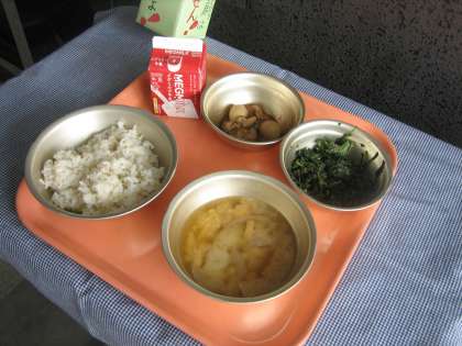 麦ごはん・牛乳・鶏肉のさっぱり煮・ほうれん草のごま煮・いものこ汁