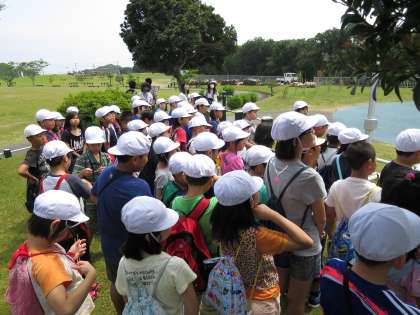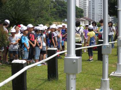 キャンプファイヤー場横で入所式を行い,校歌を歌いながら旗を揚げました。