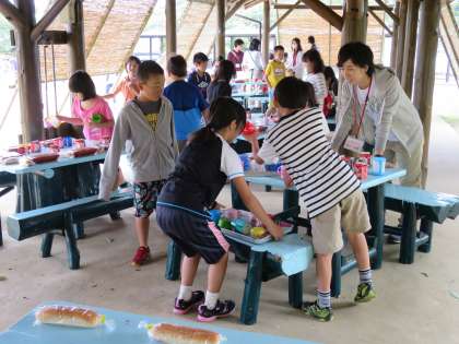 2日目の朝食は,「あずまや」です。食事係が用意をしています。
