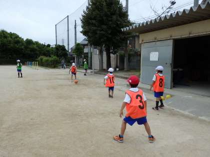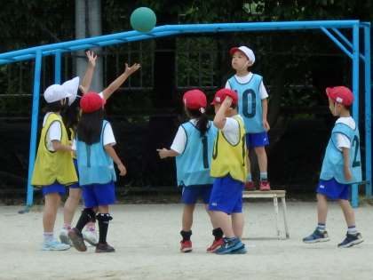 2年生は今体育でパスゲームをしています。グループに分かれて,チーム対抗でゲームをしています。みんな味方に上手にパスを回しながら,ボールを渡していきます。休憩中のチームも,運動場の空いているところで,パスを回す練習をしていました。