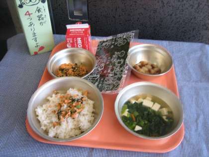 麦ごはん・牛乳・セルフおにぎり(さけとだいこん葉の具)・とら豆の甘煮・すまし汁・手巻きのり