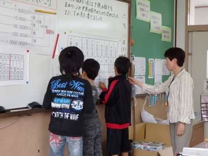 4年生は両クラスとも算数の授業が行われました。2時間目1組は算数の『一億を越える数』の学習です。3年生の復習も交えながら,一億を超える数を読んだり書いたりする勉強をしました。