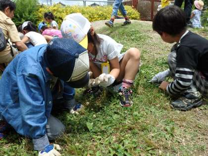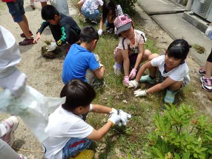 みどりの広場やちびっこ広場も大人数で一斉掃除です。範囲はとても広いですが,たくさんの人数で雑草を抜くと,あっという間に緑色だった一面が,茶色く変わっていきます。