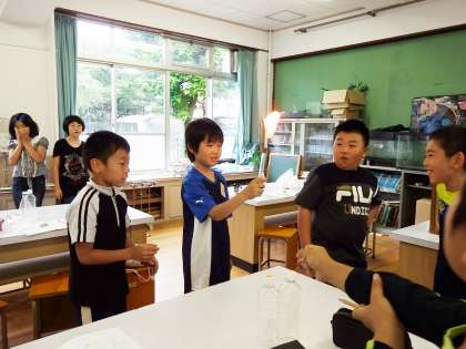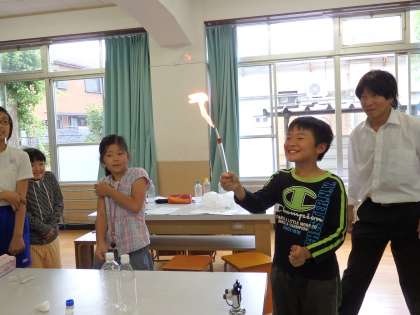 今日は6時間目にクラブ活動がありました。科学クラブでは前半に分子と原子の話をし,ブタンガスを使ったおもしろ実験をしました。