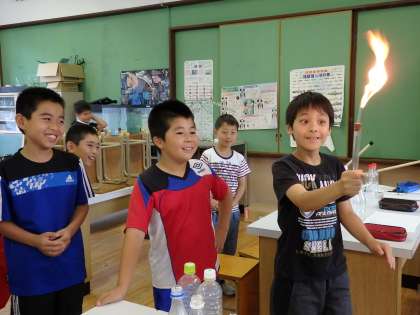 ブタンガスはライターに使われるガスです。試験管に入れて火をつけると……端に火がつきました!それだけではなく,試験管を手で持つと火がぼうっと大きくなります。みんな試験管を持ってビックリ。「火がついてるのに,めっちゃ冷たいやん!」