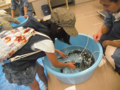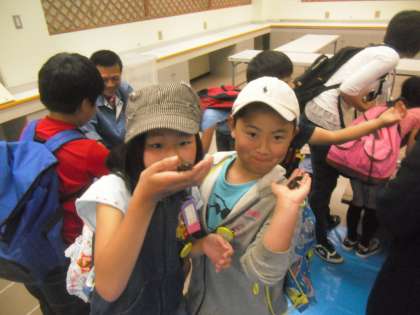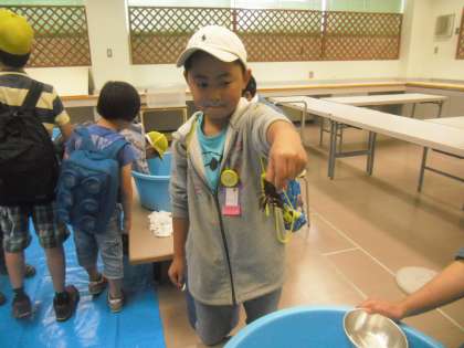 雨が降っていたので屋外展示がなかったらどうしよう??と心配していたのですが、ちゃんと設置してくださっていました。お目当ては生き物コーナーです。センターの先生の中でも生き物が好きな児童だと覚えて下さっている方も…アカハラ、ザリガニ、ミミズ…