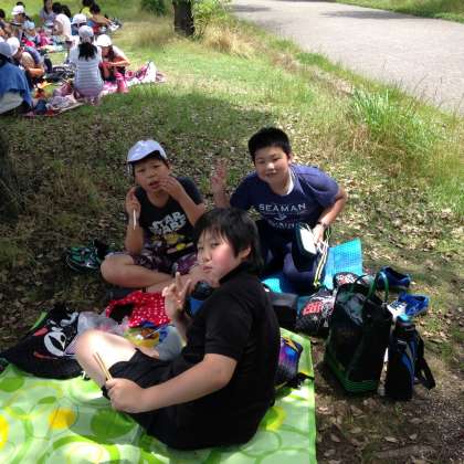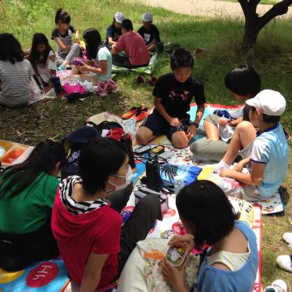 平城宮跡での昼食です。今日は晴天に恵まれ,木立の日陰を探して,グループでお弁当をいただいています。