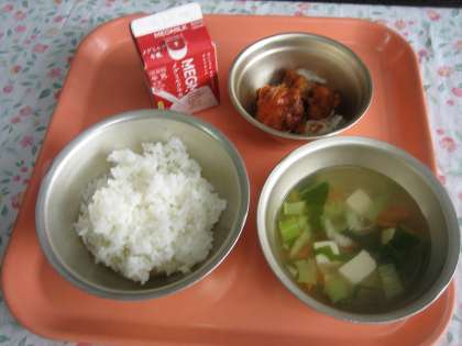 ごはん・牛乳・鶏肉のチリソース・パリパリはるさめ・とうふと青菜のスープ