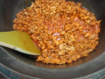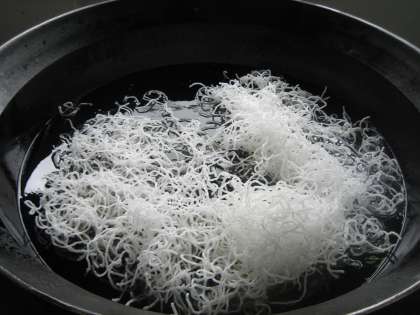 「鶏肉のチリソース」は平成26年度献立調理研究会で研究した献立です。小わんに油で揚げたはるさめを配食し、その上に鶏肉のチリソースをのせていただきます。鶏肉のチリソースをはるさめとからめながら、パリパリとした食感を楽しみながら食べました。