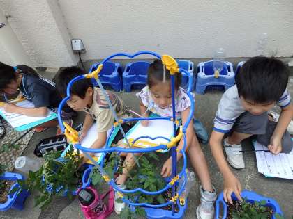 今日はトマトの苗を観察しました。みんなが植えたトマトは,もうとても大きく育っています。人によっては,もう小さなトマトの実ができています。これから実がもっと大きくなって収穫する時が楽しみです!