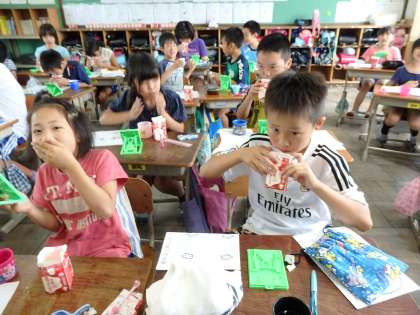 カラーテストの薬を噛むと,口の中が真っ赤!「口紅を塗ったみたい」とみんな思わず照れ笑いが出ます。特に赤くなっているところがしっかりと磨けていない部分です。手鏡で観察しながら,自分の苦手な部分をチェックしていきました。
