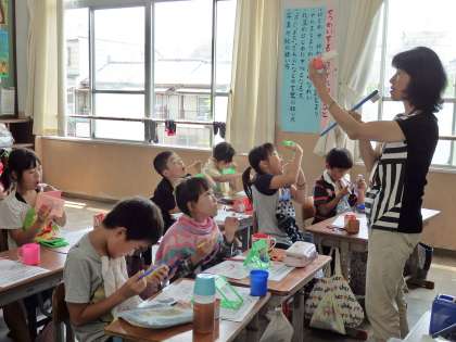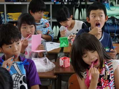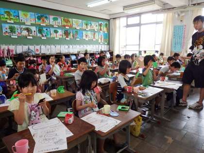今週はカラーテスト週間です。今日は3年生に養護の先生が来てくれました。先生が歯の模型を使って,上手な磨き方を教えてくれます。みんなも鏡とにらめっこしながら,赤く染まった部分をきれいに磨いていきました。