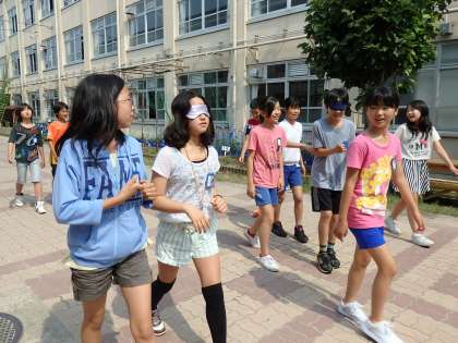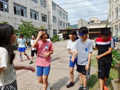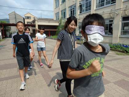 グループでアイマスクを交代して順番に体験をします。視覚が使えないと,いつも通っている場所でも不安だったり,怖く感じたりします。