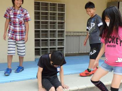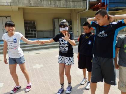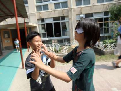 体験している子も,手を前に出して障害物がないか確かめたり,階段の所は座って1段ずつ場所を確認したり,様々な工夫をしていました。