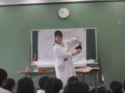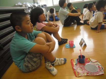今日の2時間目,4組も1年生と一緒にブラッシング指導を受ました。写真は専門家の先生から歯についてのお話を聞いているところです。とても真剣にお話を聞いています。