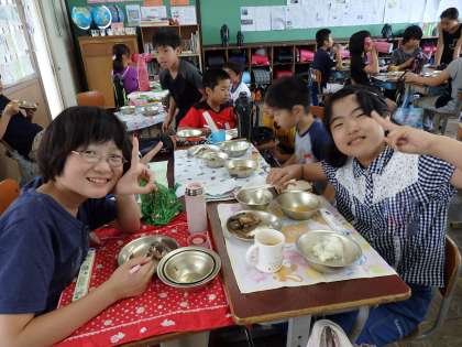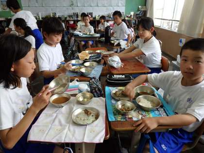 ずっと牛乳のある給食に親しんできた高学年の子たちは「牛乳がないとさびしいなぁ」という子もいましたが,和食の味わいを楽しみながら食べていました。