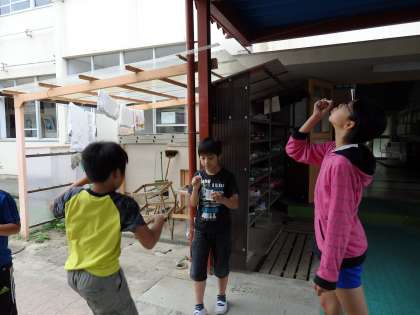 昨日のクラブ活動で,科学クラブではしゃぼん玉作りをしました。材料は洗剤,洗濯のり(PVA),砂糖,古い炭酸水(不純物のない,加熱処理した水)です。これらを上手く配合することによって,割れにくいシャボン玉液ができます。