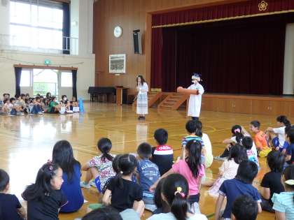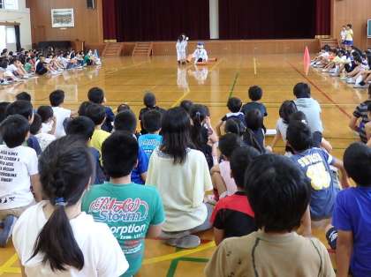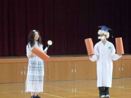 梅津北小学校に,算数の星から「算数フェアリー」と「プロフェッサー・マス」がやってきました。みんなに算数の楽しいクイズや問題を出して,もっともっと算数を好きになってもらえるように来たそうです。