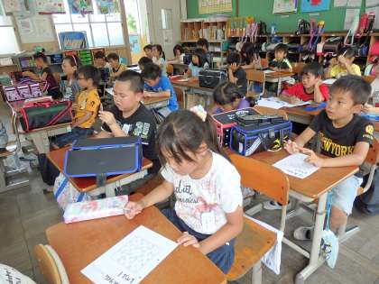 2年生は数独の問題にチャレンジしました。数独は縦横9マス,3×3の正方形の中に,1〜9の数字を書きいれていくパズルゲームです。正方形の中や1列の中に同じ数字が入らないように入れていきます。先生にルールを説明してもらったら,自分たちで解いていきます!