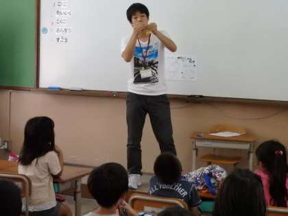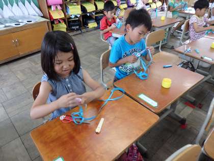 1年生は「メビウスの輪」を作ってみました。「メビウスの輪」の真ん中をまっすぐ切っていくと,どんなことがおこるのかな?という実験です。2つの輪ができる!という子や,大きくなる!という子など,様々な考えが浮かびます。さて,答えは……?