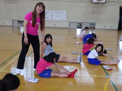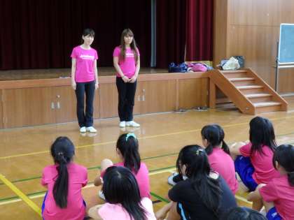 金曜日はチアリーディング部の子たちが待ちに待っていた,チアリーディングのプロの先生の講習会でした。京都ハンナリーズのチア『はんなりん』の方が来てくださって,みんなに練習のしかたや踊りを教えてくださいました。