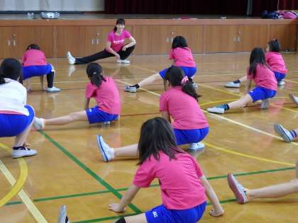 まずは準備体操。普段やっている準備体操以外の方法や筋トレも教えてもらいます。時々先生が柔軟を手伝ってくださいます。