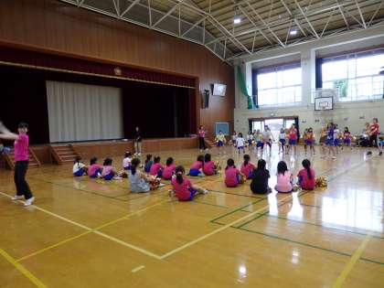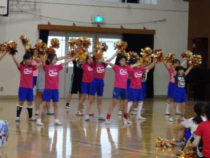 踊りの後は,いつも部活動でしている「見合いっこ」をします。今日はせっかくの講習会なので,本番用のポンポンを使って,楽しく踊りました。