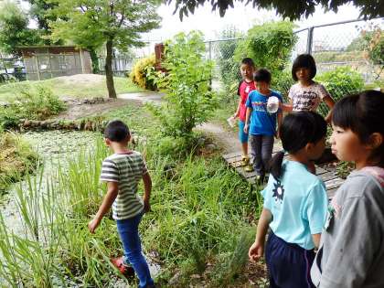 夏も近づき,ちびっこ広場や池の周りには生き物がたくさん!最近は他の学年の子たちと生き物探しもしています。ちびっこ広場の池にはカエルが,周りの草むらにはバッタ,そして地面にはダンゴムシがたくさんいます。