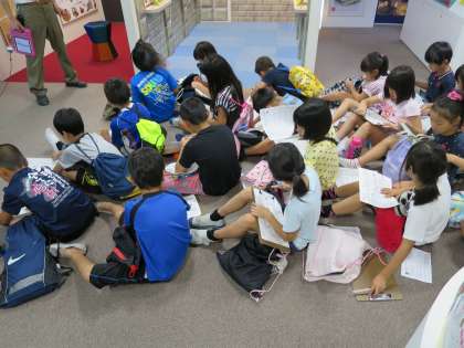 殿堂学習の場所で学習プリントに名前を書いたり,説明を聞いたりしました。