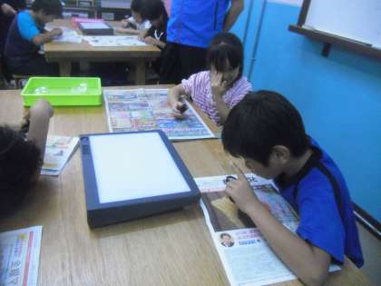 印刷のしくみを学習した後で、実際にルーペで新聞紙の写真を見ました。よく見ると、小さな点が集まっていることが分かり、子どもたちは色々な新聞やちらしの写真を見ていました。