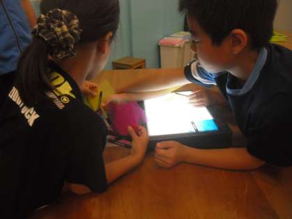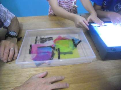 印刷された写真は、青・赤・黄・黒の4色で作られているということを学習しました。それを実感するために、果物の写真を青・赤・黄・黒にコピーした透明パズルにチャレンジしました。透明パズルを青・赤・黄・黒の順に組み合わせると、どんどん他の色が作り出され、子どもたちも感動していました。