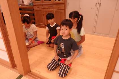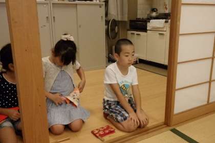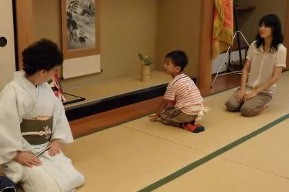 まずは低学年部から。低学年部は今回もお茶菓子はなしで,お座敷入りや挨拶の基本練習からです。「座るところは畳の16目……」など,前回先生が教えてくださったこともしっかり覚えていて,みんな確認をしながら1つ1つのお作法をこなしていきます。