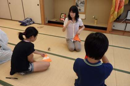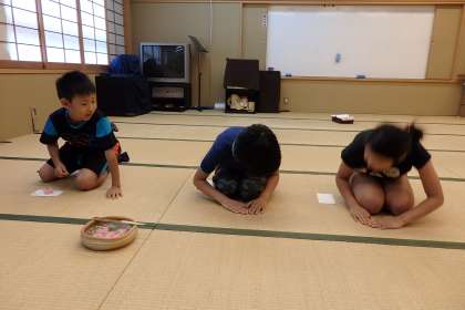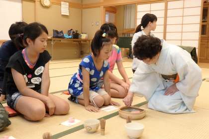 ベテランの子たちは袱紗捌きもお茶菓子の取り方も,お手の物!長い子では5年以上茶道を嗜んでいるそうです。一緒に参加している教職員も,子どもたちにお作法を教えてもらいます。