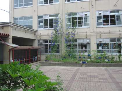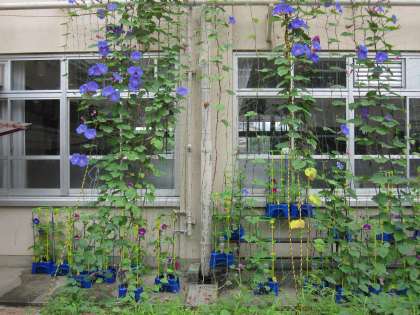 環境教育の一環として、夏の日差しを朝顔でしのぎます。梅雨が明ければ、もっと威力を発揮することでしょう。