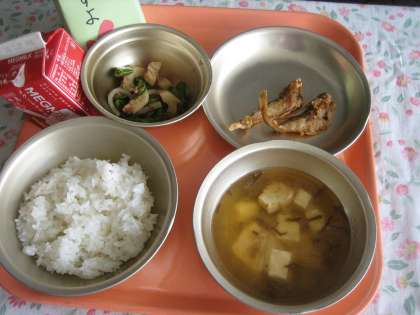 ごはん・牛乳・はたはたのこはくあげ・伏見とうがらしのおかか煮・もずくのみそ汁