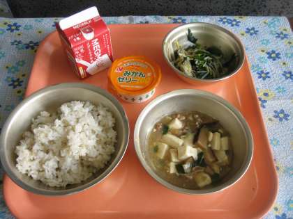 麦ごはん・牛乳・五目どうふ・ほうれん草ともやしのいためナムル・みかんゼリー
