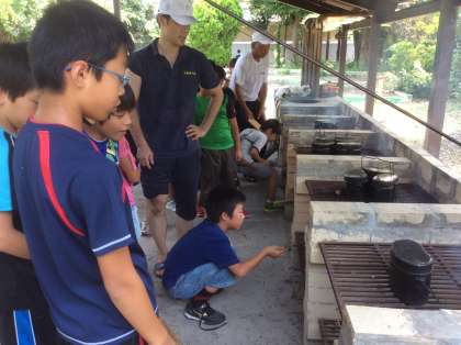 みどりの広場にある野外炊事場での飯盒炊さん。おいしいご飯が炊けました。体育館の中でみんなでおいしくいただきました。