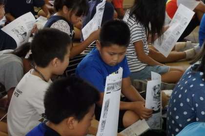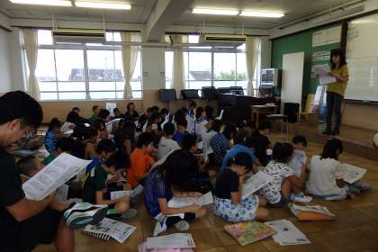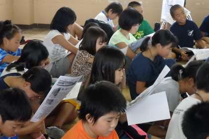 5年生も1・2組合同で登校日をしました。音楽室に集まって,戦争について学ぶ平和学習です。先生に配られたプリントを読みながら,みんな真剣に話を聞いていました。