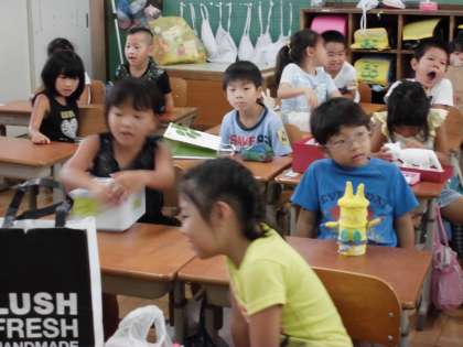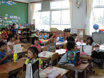 1年生の教室では夏休みの宿題発表をしていました。貯金箱やおもちゃなど,どれもとっても個性があふれる作品です。作品は1人1人前に出て,どんなものを作ってきたのか発表をしました。