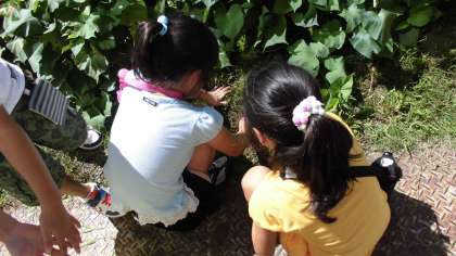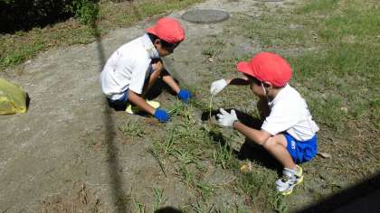 まずは校内清掃のようすからお伝えします。校内の清掃は1〜3年生が担当です。花壇周りやちびっこ広場の草抜きを中心に行いました。